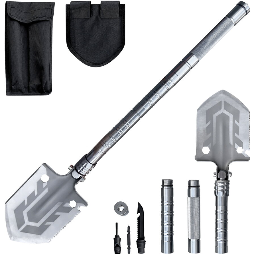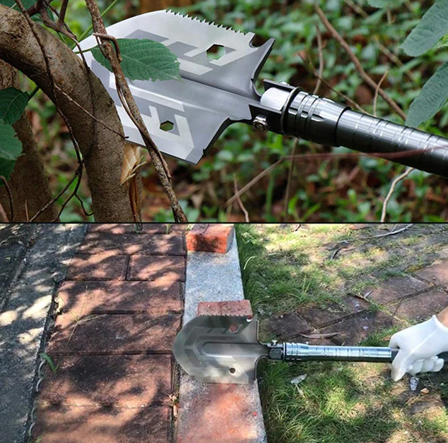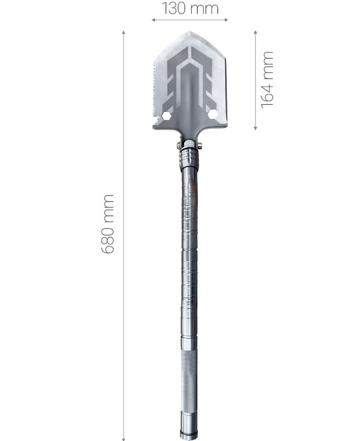 Lopata pliabila multifunctionala va satisface nevoile tuturor utilizatorilor carora le place sa-si petreaca timpul liber in natura. Lopata multifunctionala este excelenta pentru camping, expeditii cercetase sau poate fi folosita in gradina. Lopata este fabricata din otel, manerul are o suprafată zimtata pentru o mai buna prindere. Lopata este multifunctionala, deoarece ofera diverse modificari. Capul lopetii este schimbabil cu un ferastrau, deschizator de sticle, topor, metru cu o valoare de pana la zece centimetri. Lopata este reglabila la 180 de grade, ceea ce permite folosirea lamei ca sapa. Manerul lopetii este impartit in trei parti, pe care le desurubati pur si simplu. In maner veti gasi un cutit tactic, o surubelnita, un fluier si un silex / amnar pentru foc. Capatul manerului ofera un varf metalic pentru spargerea de urgenta a geamului. Intreaga lopata multifunctionala este pliata intr-un pachet cu model de camuflaj. Produsul este potrivit pentru persoane de peste 18 ani sau cu supravegherea unui adult.